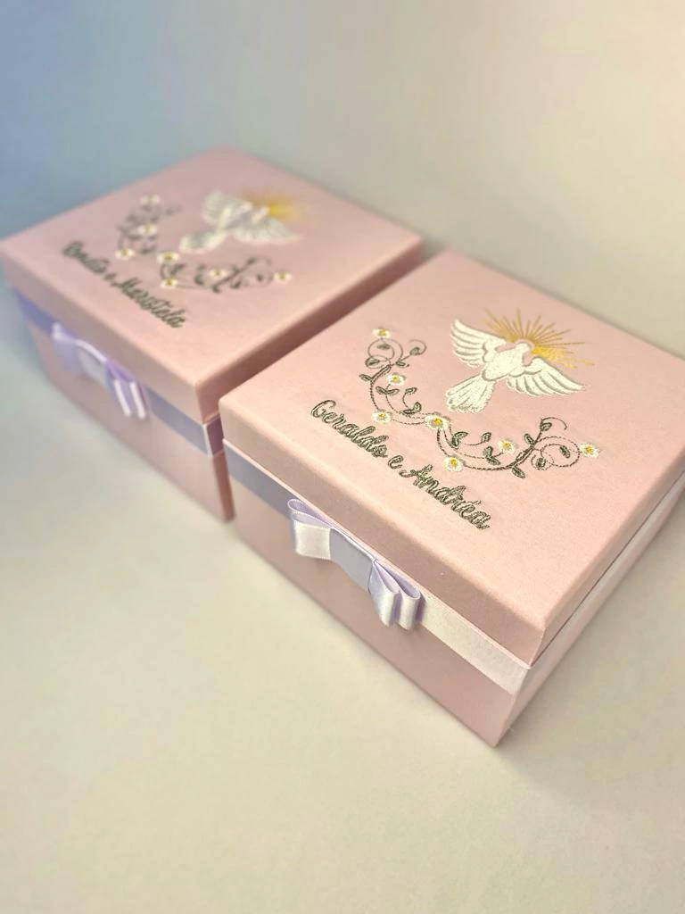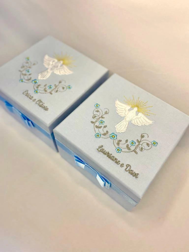 Caixa mdf, modelo com dobradiça, revestida com tecido de algodão liso, bordado na parte externa da tampa, mensagem personalizada na parte interna com impressão em papel fotográfico e laço de cetim na base.
