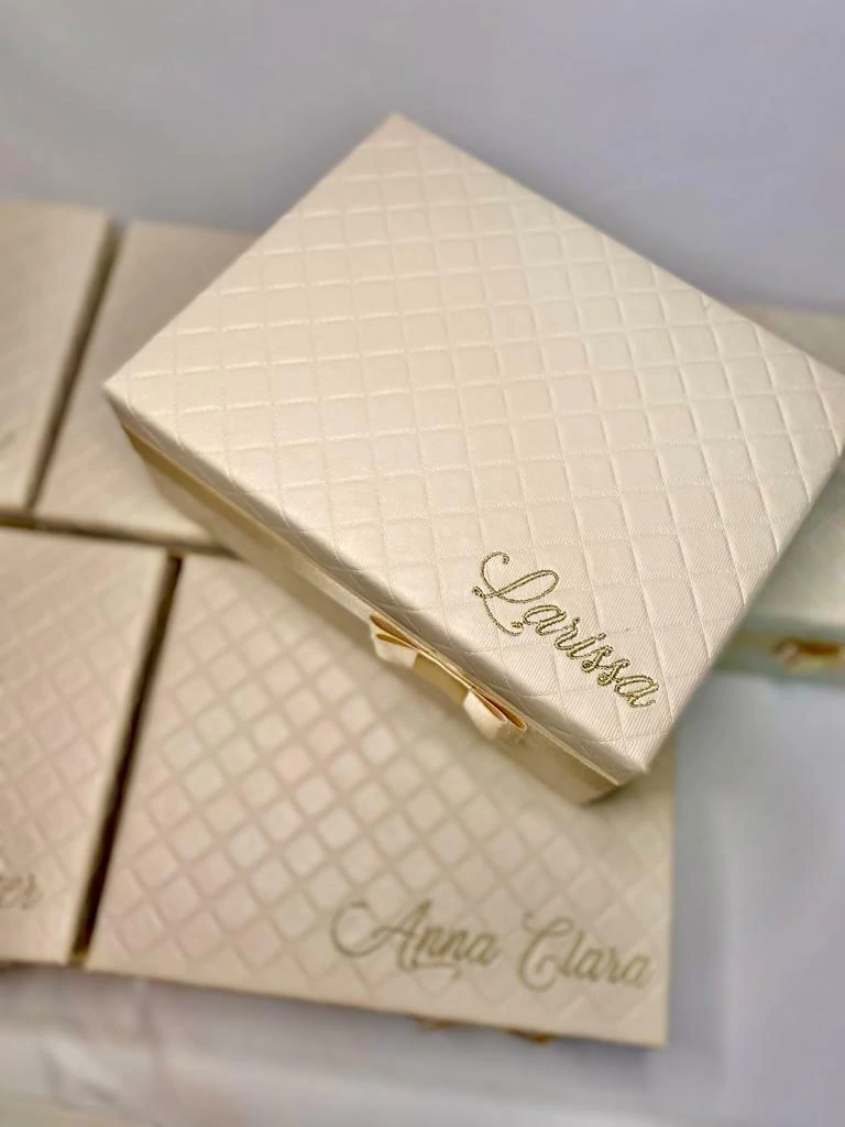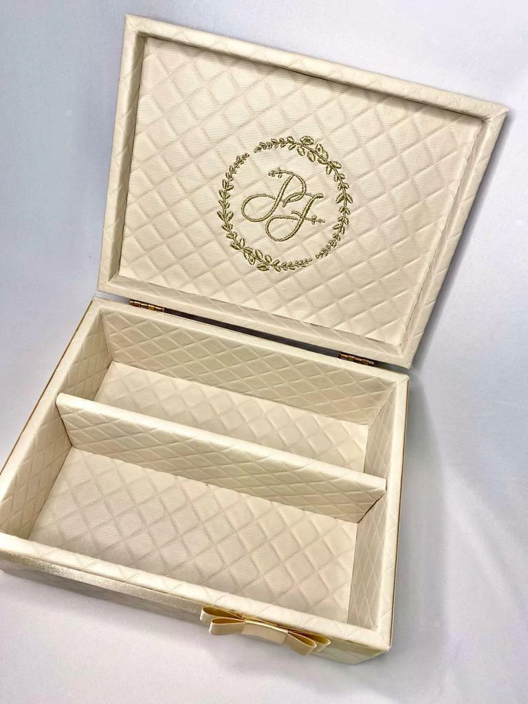 Caixa mdf, modelo tampa com dobradiça, revestida em corino, com bordado na parte interna e externa da tampa e laço de gorgurão na base.