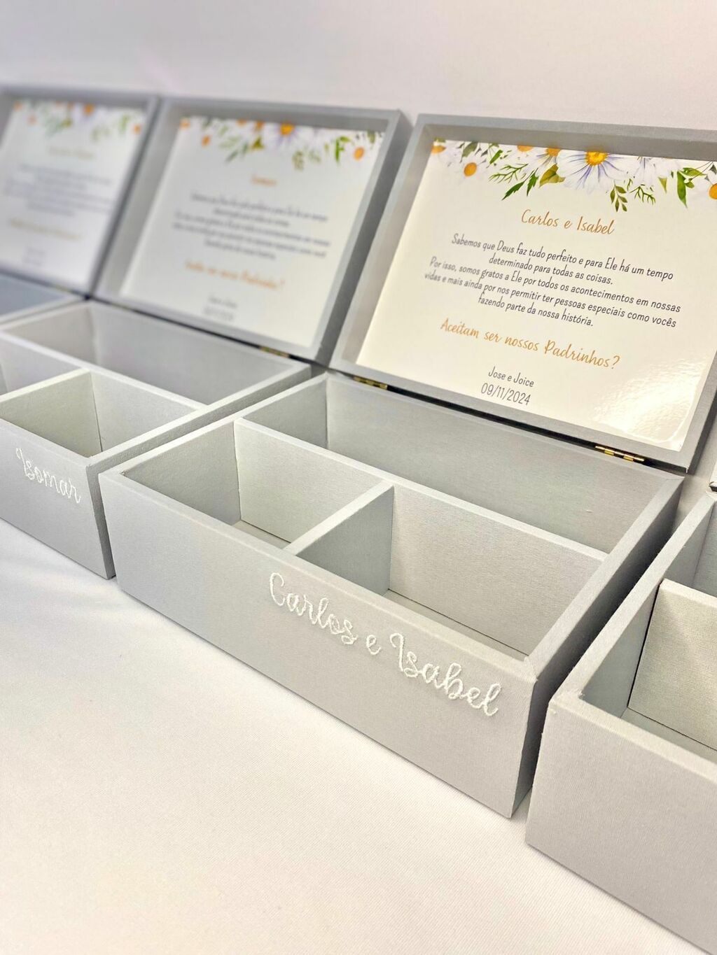Caixa mdf, modelo com dobradiça, revestida com tecido de algodão liso, bordado na parte externa da tampa e nome na base e mensagem personalizada na parte interna da tampa.