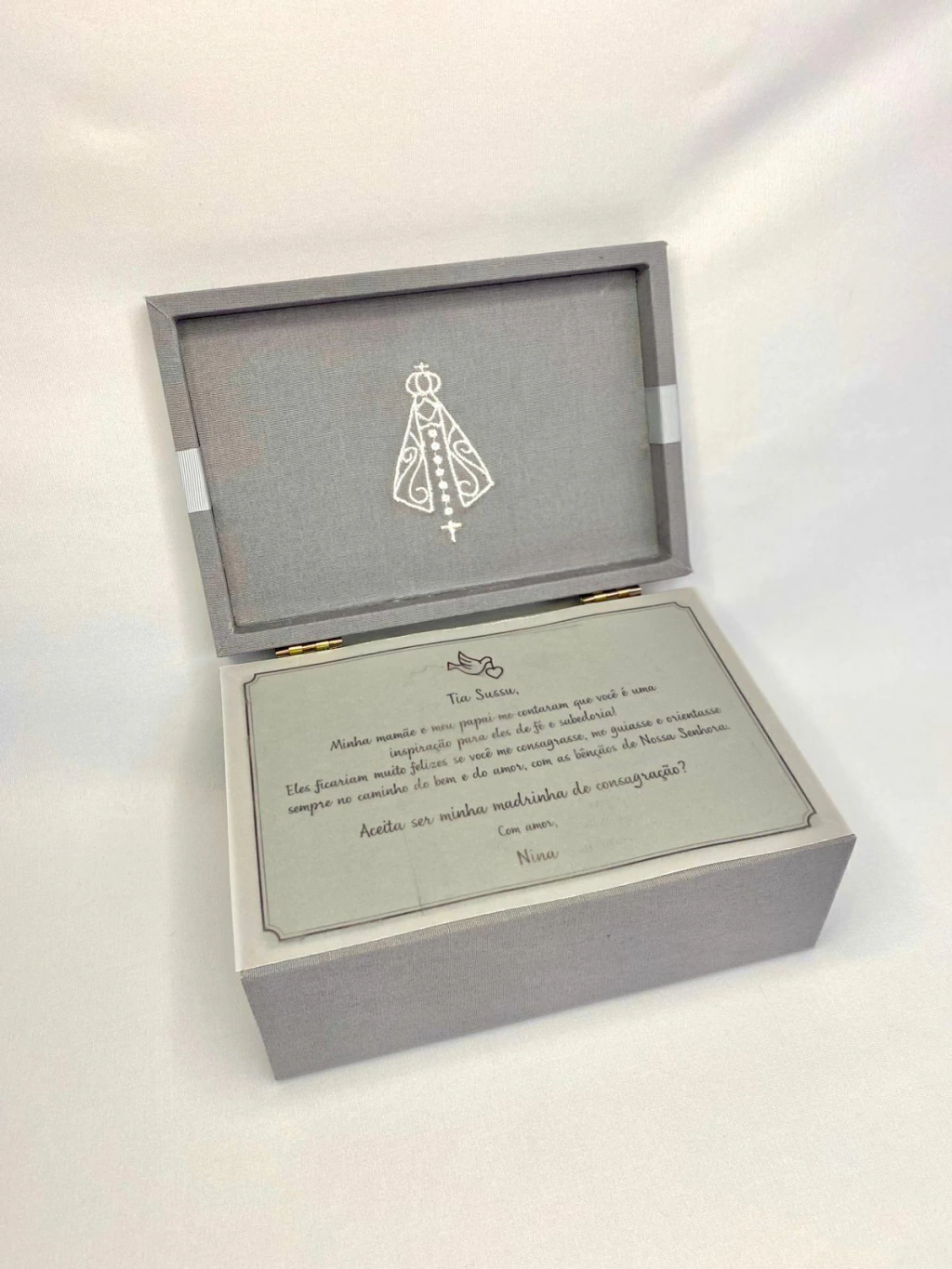 Caixa mdf, modelo com dobradiça, revestida em tecido de algodão liso, laço de gorgurão na parte externa da tampa, bordado na parte interna e mensagem personalizada com impressão em papel vegetal.