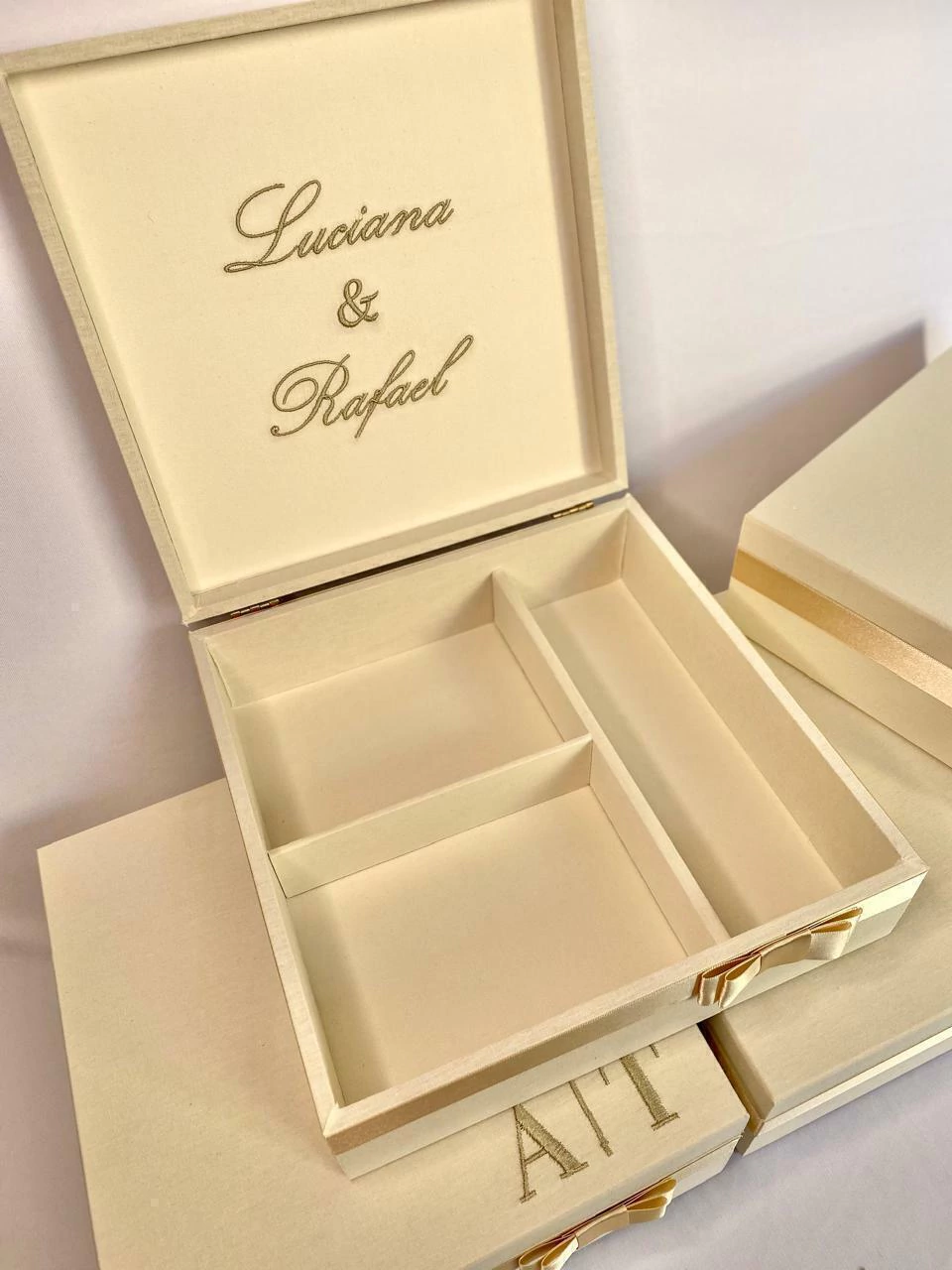 Caixa mdf, modelo com dobradiça, revestida com tecido de algodão liso, bordado na parte interna e externa da tampa e laço de cetim na base.