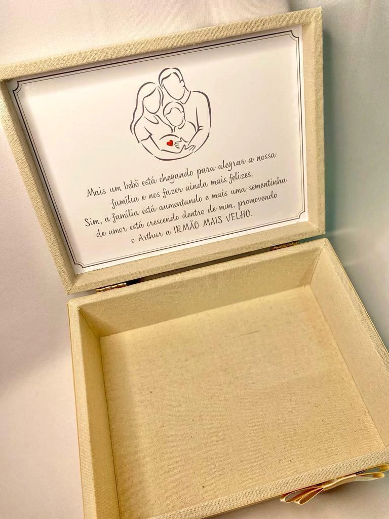 Caixa mdf, modelo com dobradiça, revestida em linho, bordado na parte externa da tampa, mensagem personalizada na parte interna com impressão em papel fotográfico e laço de cetim na base.