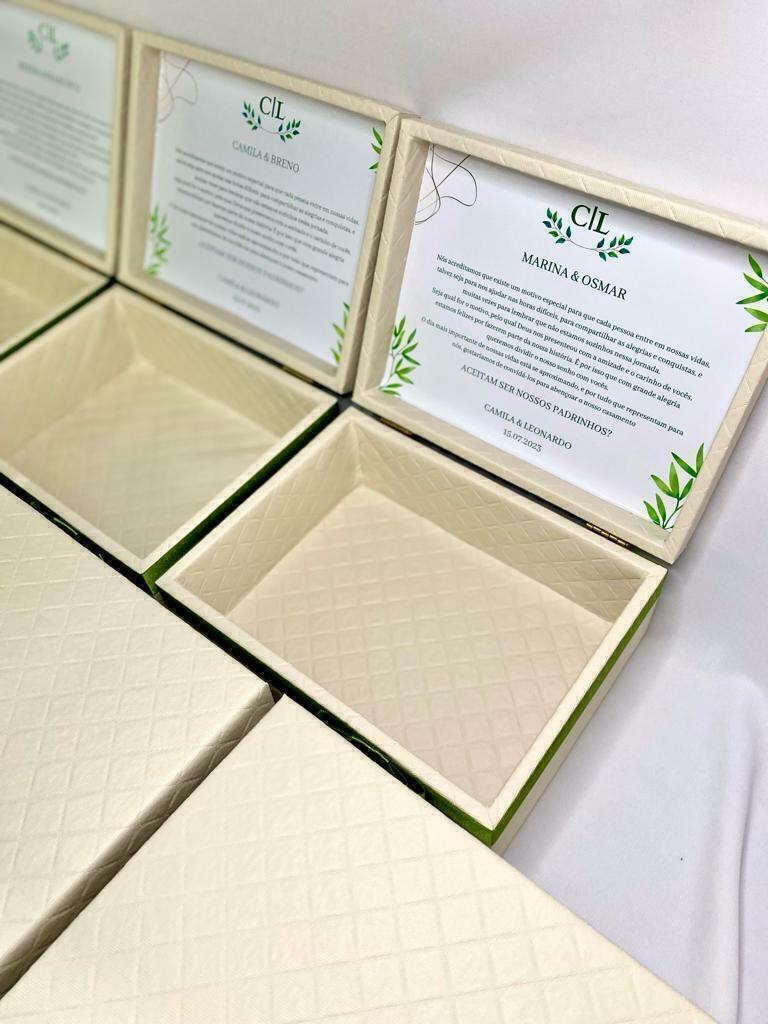 Caixa mdf, modelo tampa com dobradiça, revestida com corino, bordado na parte externa da tampa, mensagem personalizada com impressão em papel fotográfico e laço de cetim na base.