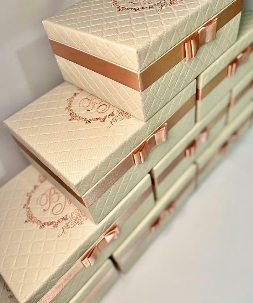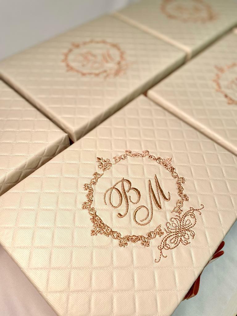 Caixa mdf, modelo tampa com dobradiça, revestida com corino, bordado na parte externa da tampa, mensagem personalizada com impressão em papel fotográfico e laço de cetim na base.