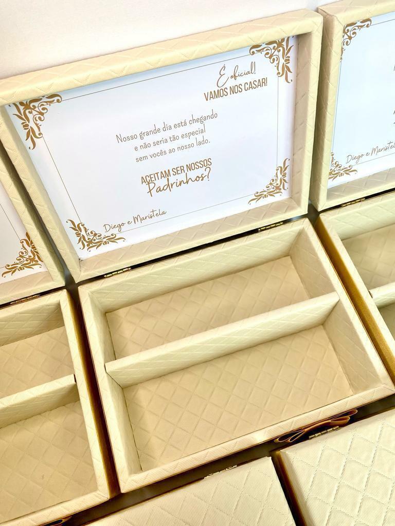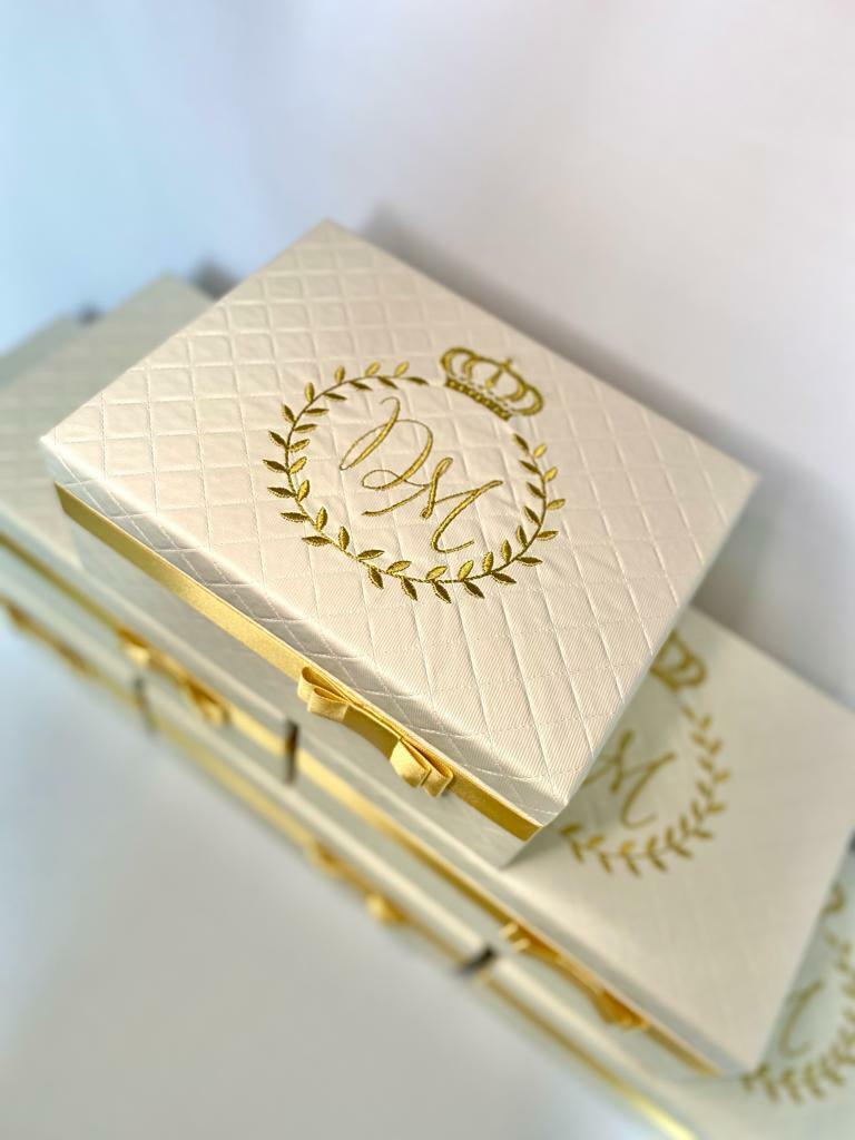 Caixa mdf, modelo tampa com dobradiça, revestida com corino, bordado na parte externa da tampa, mensagem personalizada com impressão em papel fotográfico e laço de cetim na base.