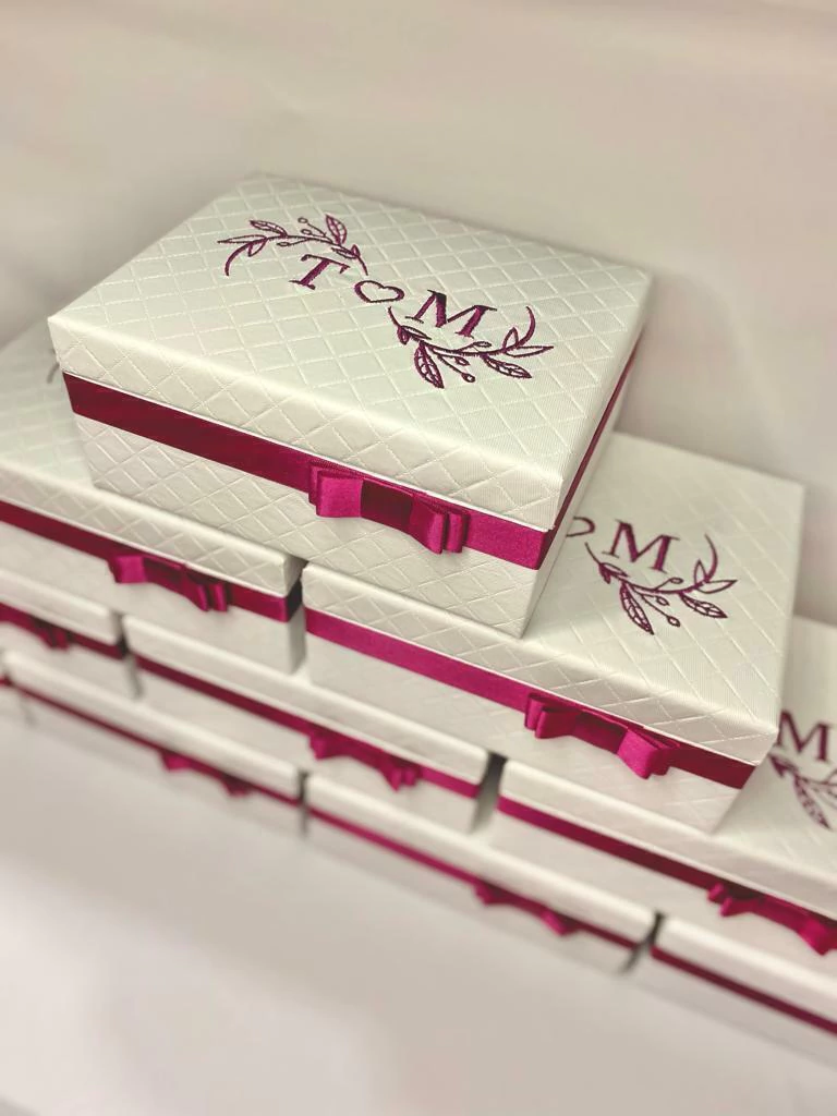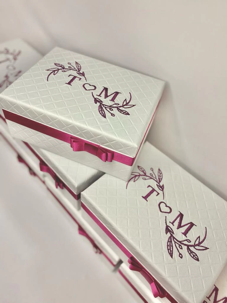 Caixa mdf, modelo tampa com dobradiça, revestida com corino, bordado na parte externa da tampa, mensagem personalizada com impressão em papel fotográfico e laço de cetim na base.