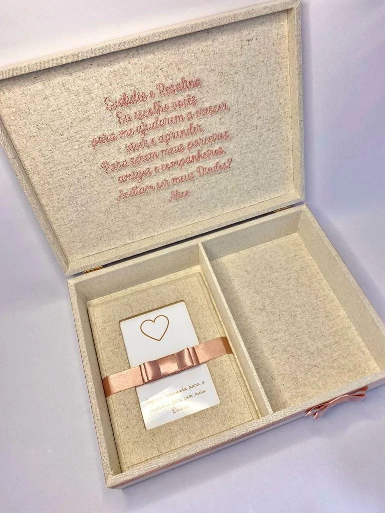 Caixa mdf, modelo com dobradiça, revestida em linho, com bordado na parte interna e externa da tampa e laço de cetim na base.