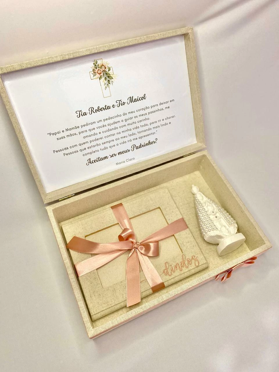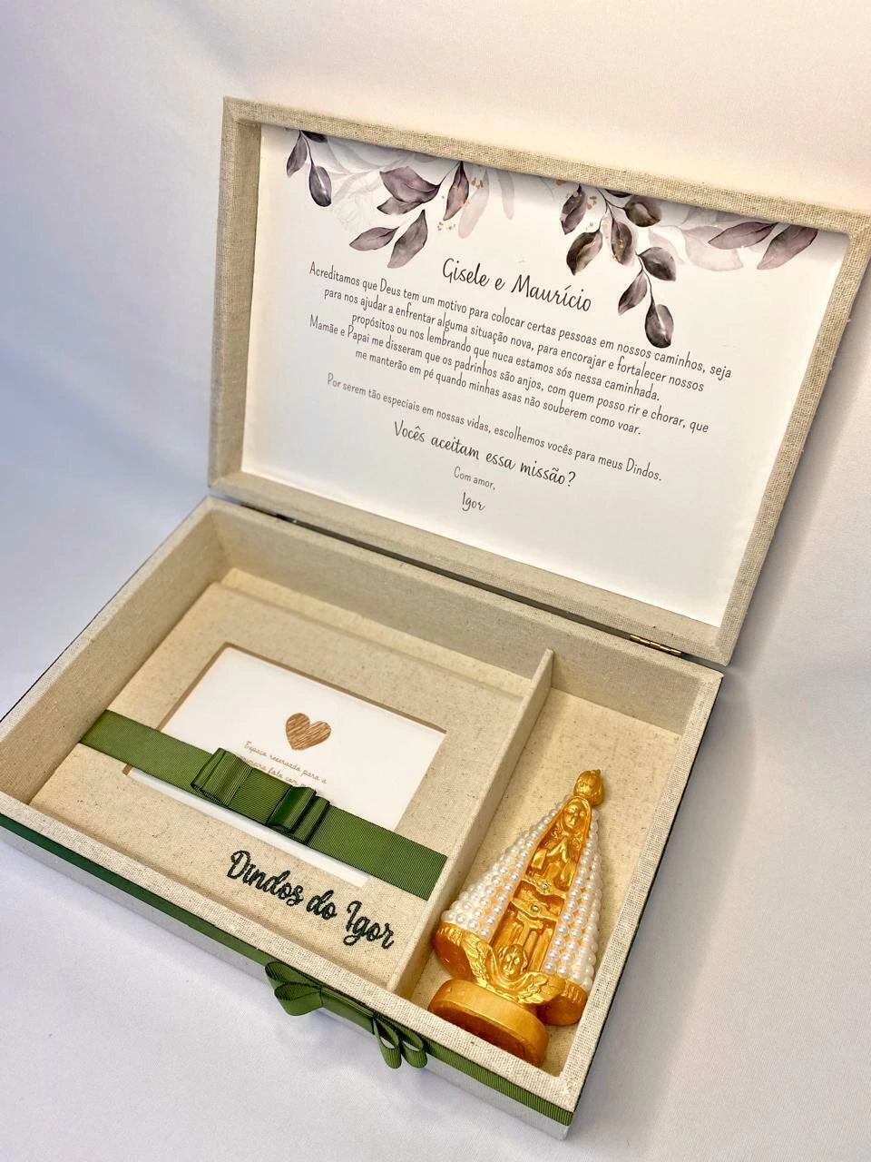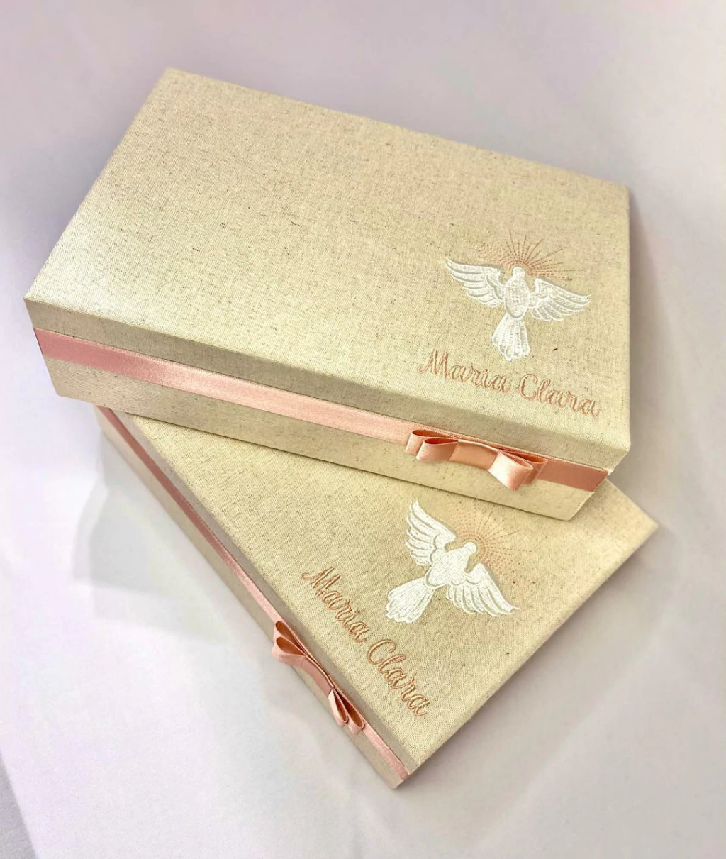 Caixa mdf, modelo com dobradiça, revestida em linho, bordado na parte externa da tampa, mensagem personalizada com impressão em papel fotográfico e laço de cetim na base.