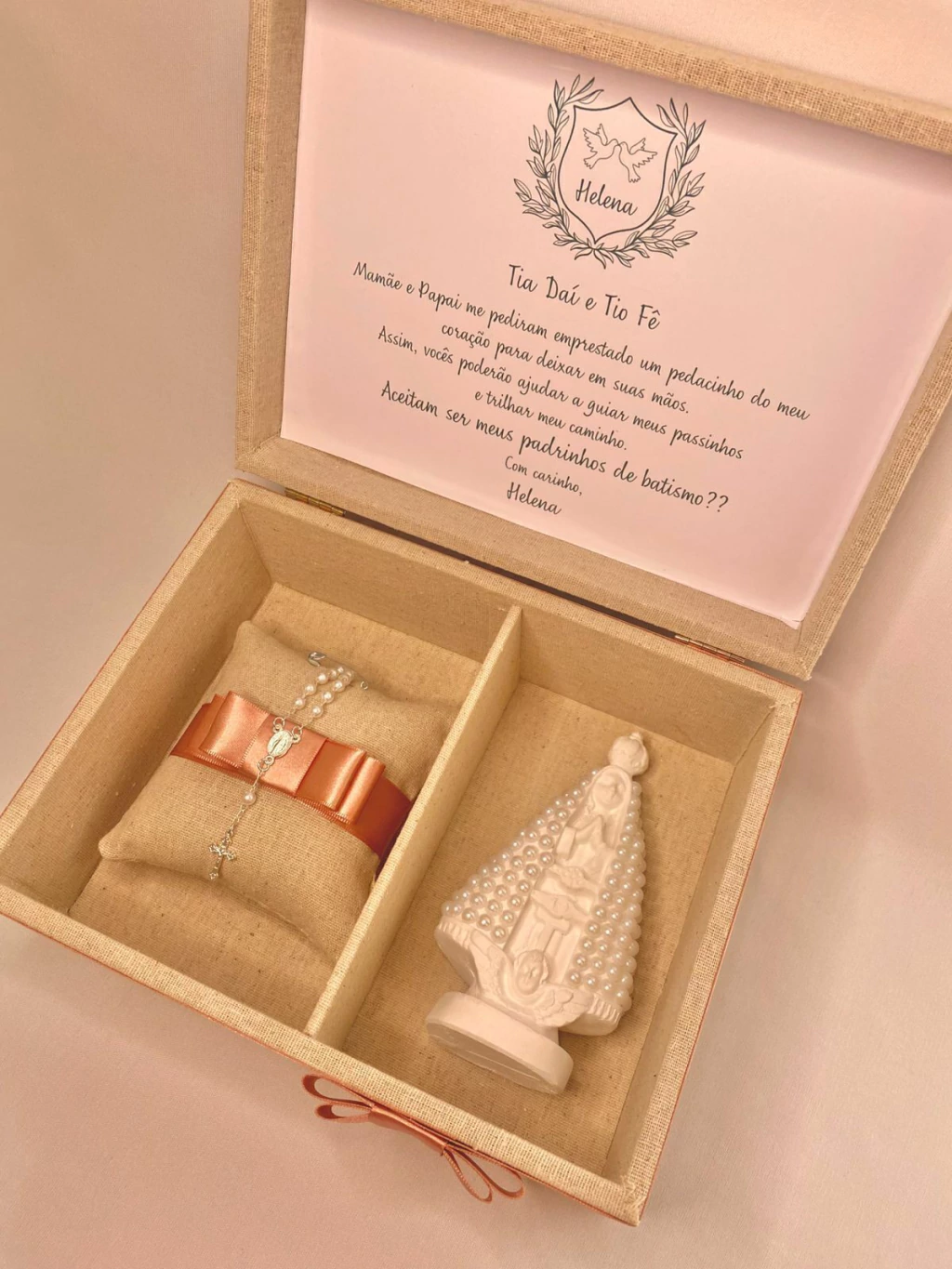 Acompanha uma almofadinha com mini terço e uma santinha.
