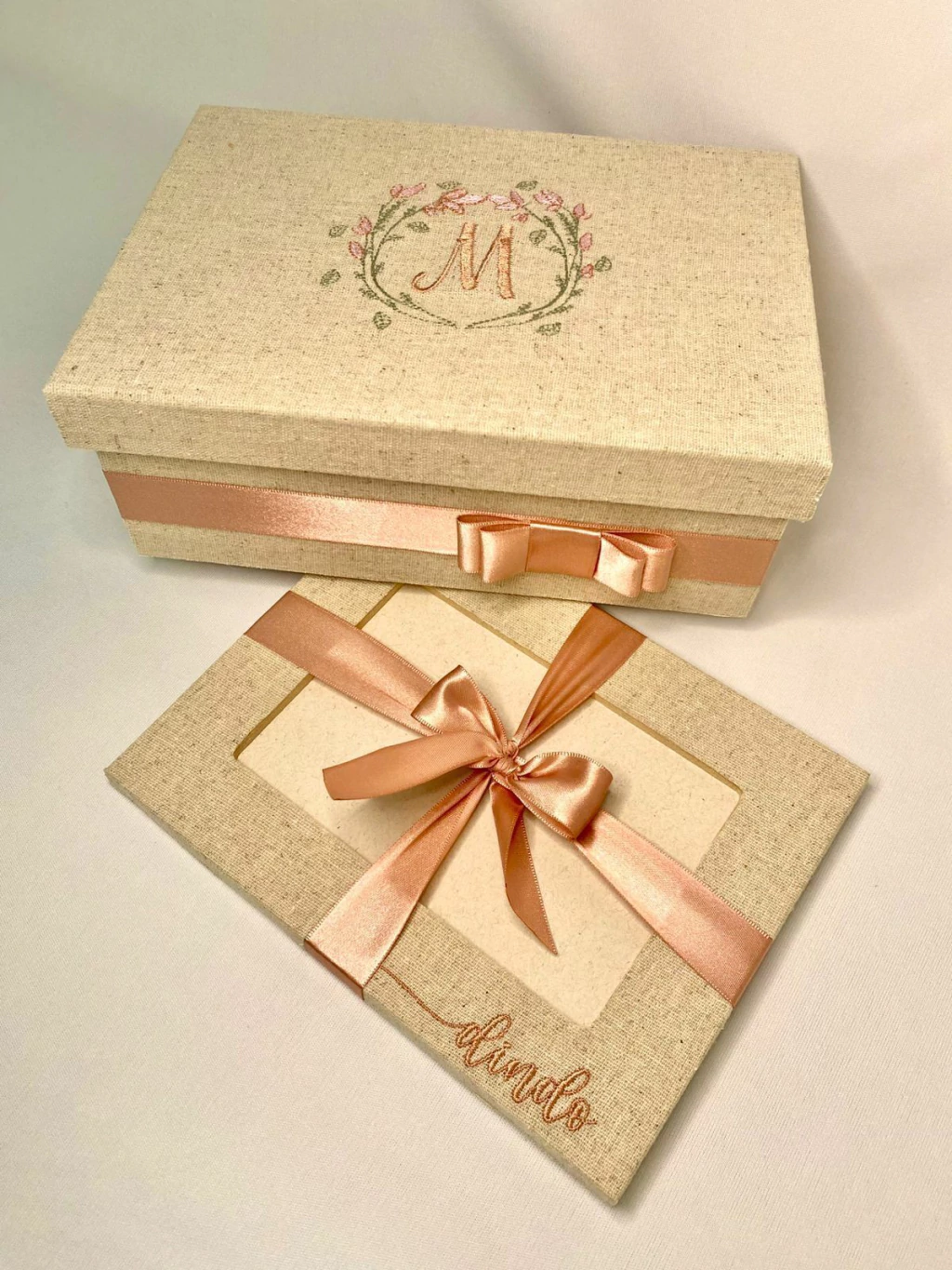 Caixa mdf, modelo tampa de sapato, revestida com linho, bordado na parte externa da tampa, mensagem personalizada na parte interna com impressão em papel fotográfico e laço de cetim na base.