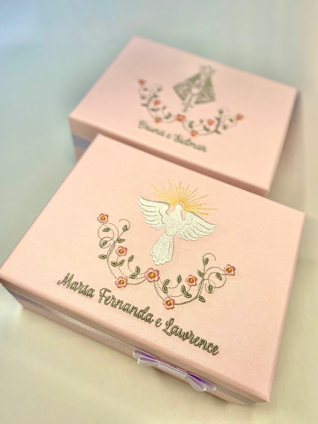 Caixa mdf, modelo com dobradiça, revestida com tecido de algodão liso, bordado na parte externa da tampa, mensagem personalizada na parte interna com impressão em papel fotográfico e laço de cetim na base.