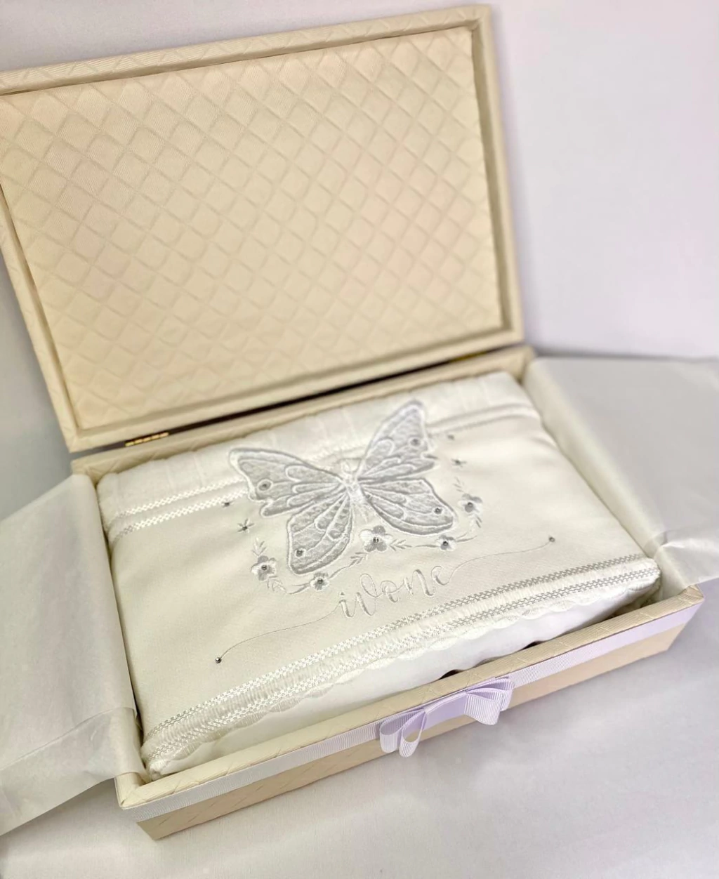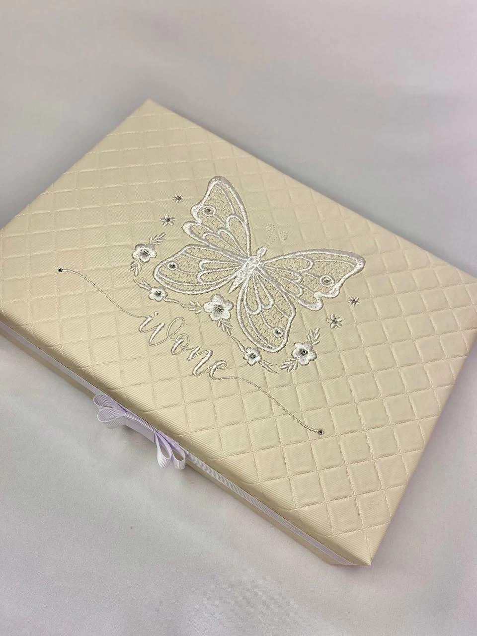 Caixa de mdf, modelo com dobradiça, revestida em courino, com bordado na parte externa da tampa e laço de cetim na base.