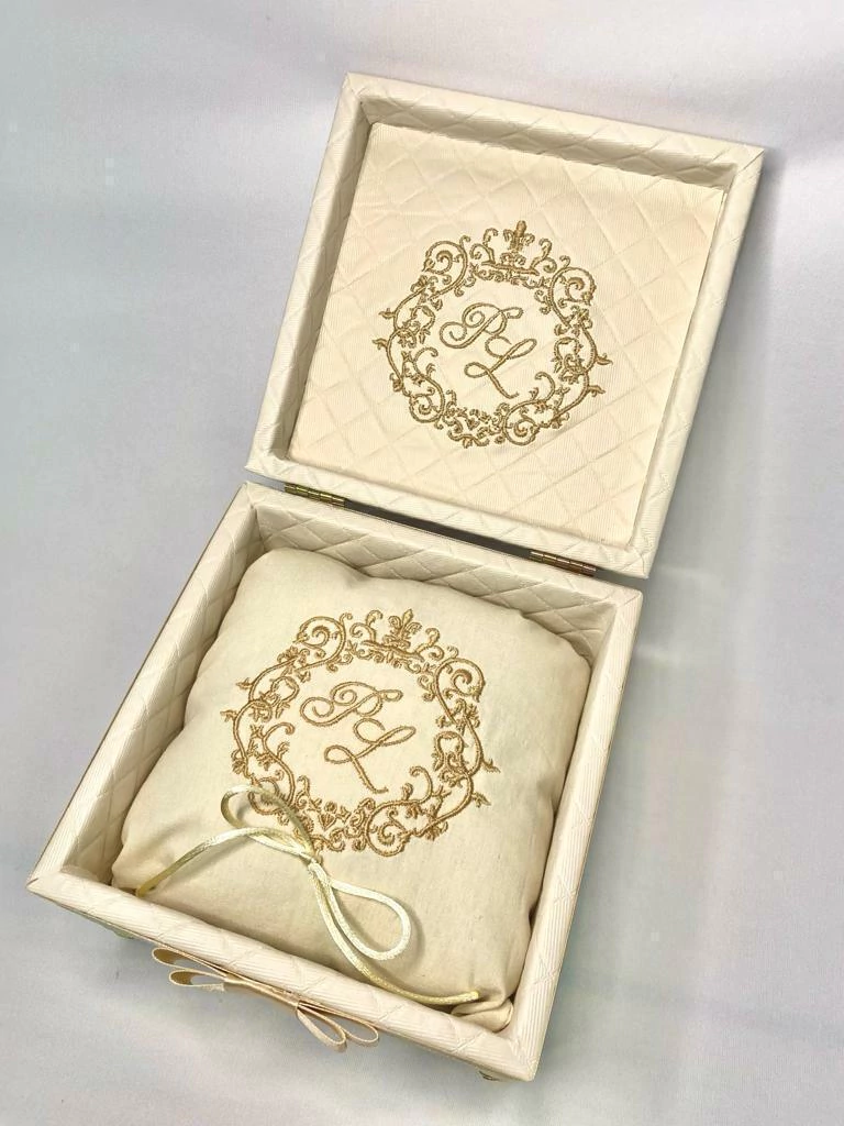 Caixa mdf, modelo com dobradiça, revestida em corino, bordado na parte interna e externa, laço e pezinho na base.